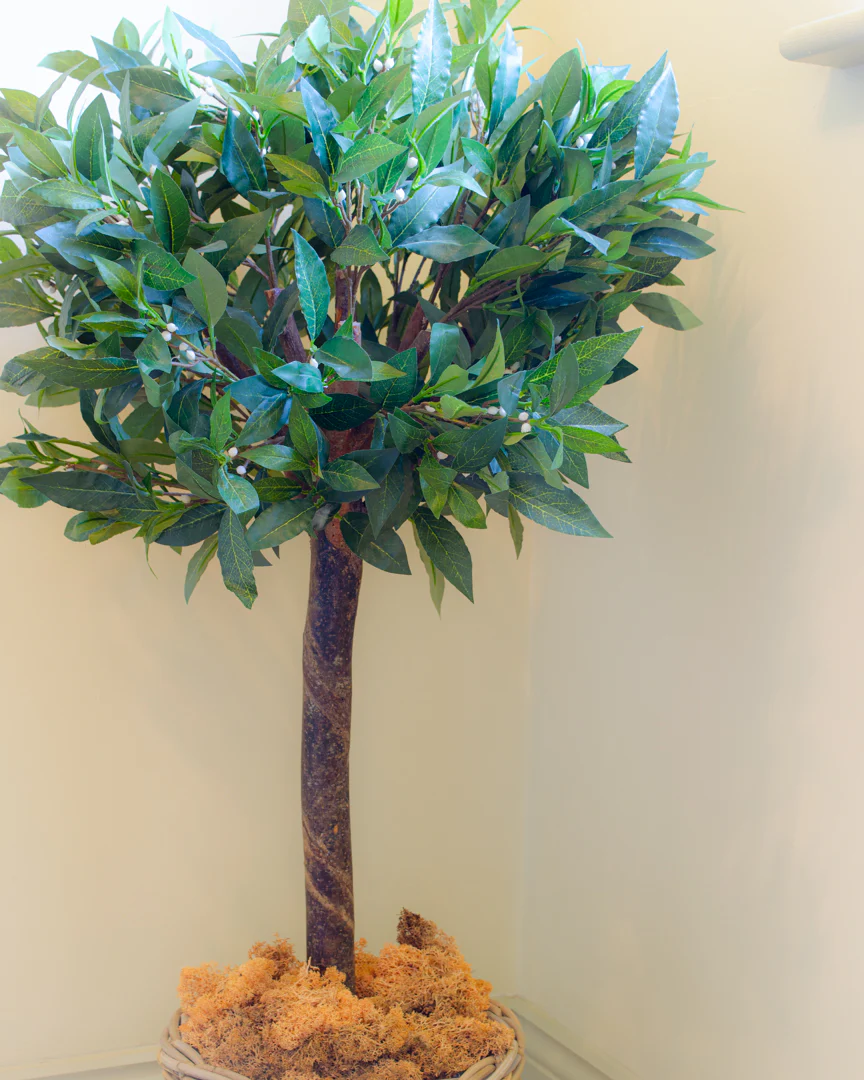 A stunning realistic laurel tree, made with a real wooden trunk for incredible authenticity and real luxury. This laurel tree is shaped into a ball with luscious realistic green leaves, finished with little white buds. Use in sheltered area if using outside.