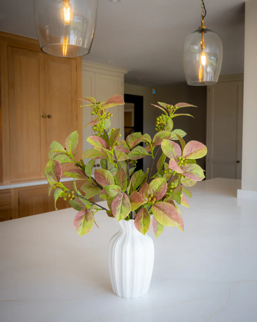 Bring the warm hues of autumn into your home with this stunning bundle of artificial autumn berry foliage (3 large stems). Featuring lifelike leaves in soft greens and rustic reds, accented with natural-looking berries, this arrangement adds a touch of seasonal charm to any space.