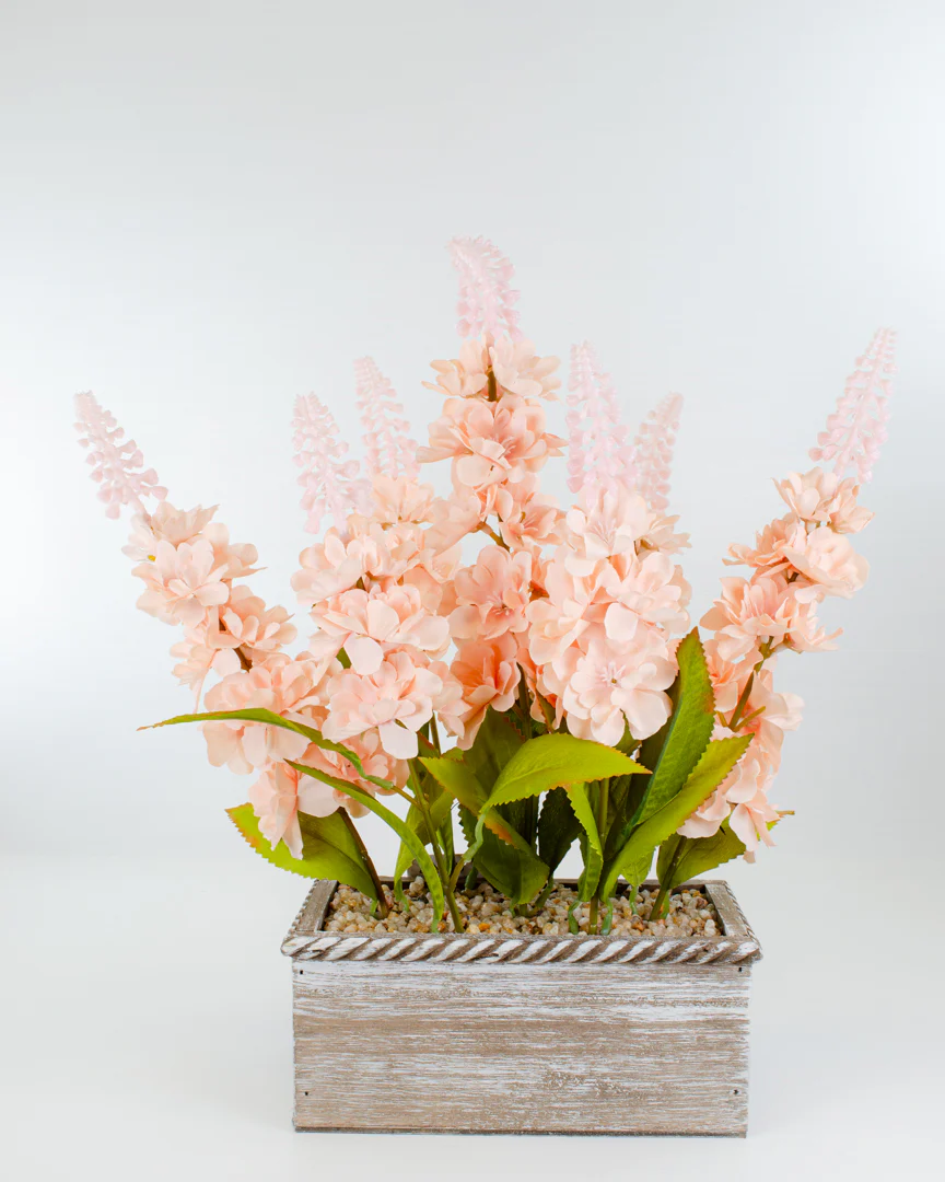 DELPHINIUMS IN WOODEN TRUG - TWO COLOURS