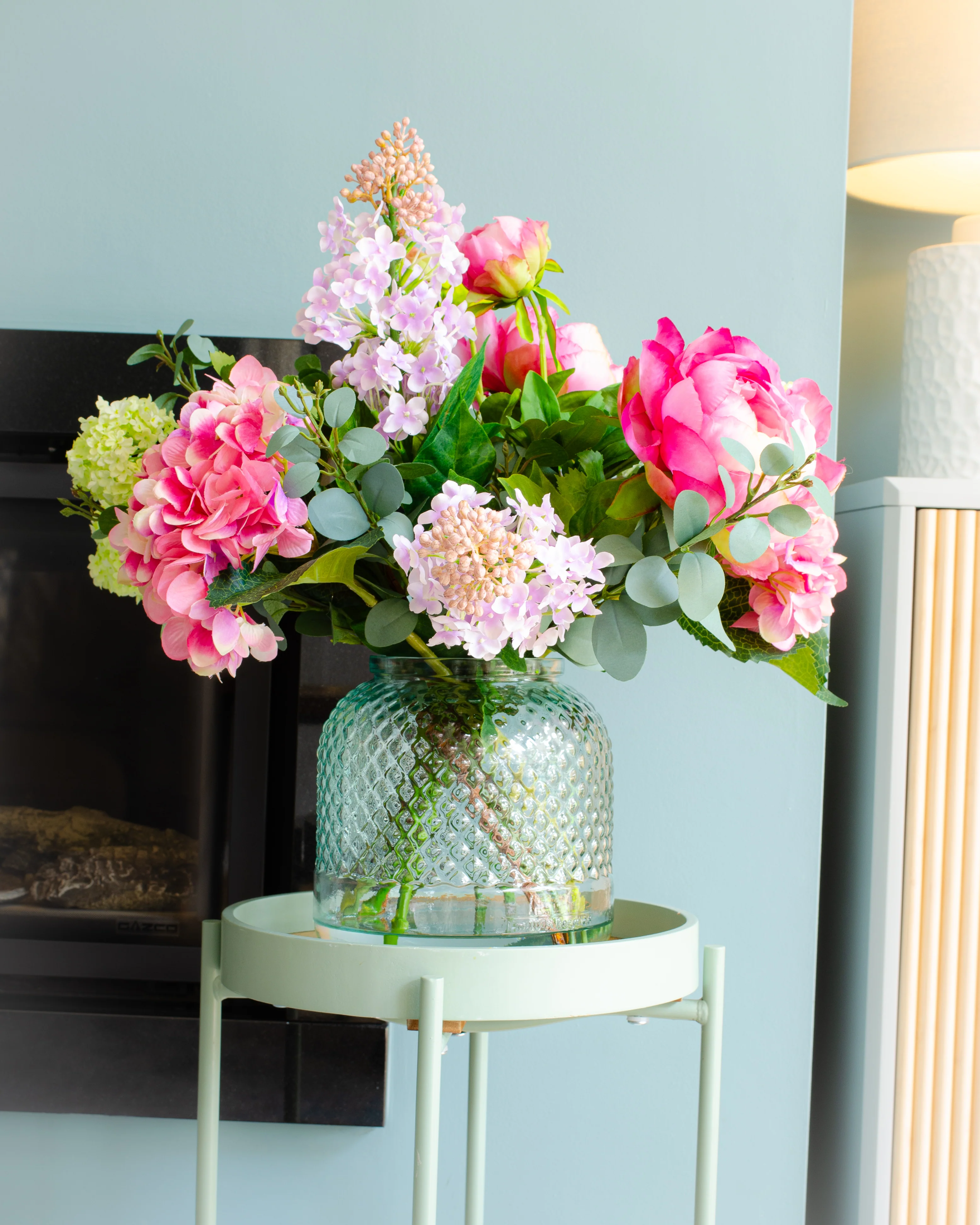 Wow, this is a statement and a half! This arrangement is full of English garden beauties, including fully vibrant pink peonies, extra large hydrangeas, lilac flowers in full bloom, viburnum and finished with an abundance of eucalyptus. This stunning floral display comes in a textured glass vase, which is subtly green in colour, complimenting the blooms perfectly. Statement arrangements do not get much more 'wow factor' than this.