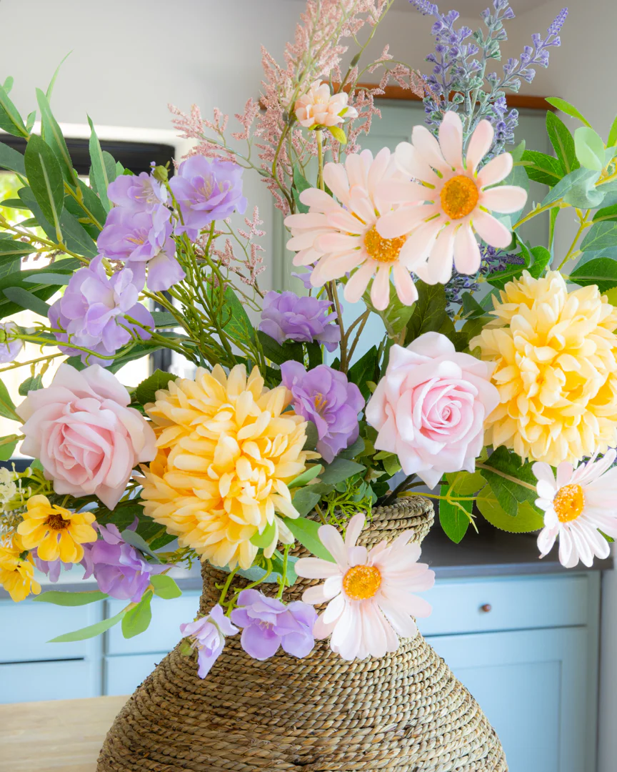 A stunning showstopper luxury faux bouquet, representing an English country garden in pretty pastel hues. Delicate and beautiful, with large and small silk flowers, intertwined with lavender and wild daisies - just as it would be in Miss Honey's garden!