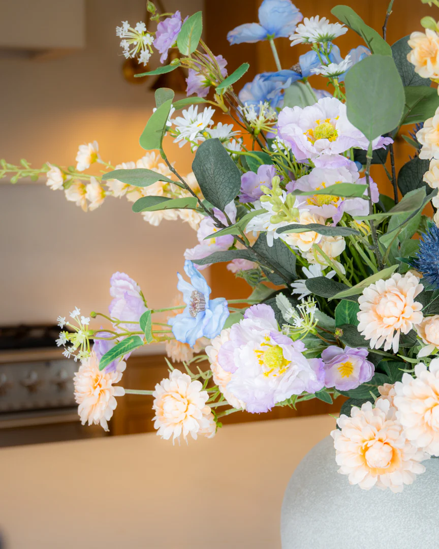 Bring the spring freshness indoors with our show stopper Luxury Spring Pastels Bouquet. A stunning mix of high quality artificial dahlias, delphinium, blossom, mini meadow flowers, daisies, poppies, thistles and finished with an abundance of seasonal foliage. A bouquet made to feel as though it has just been gathered from a wild meadow garden!