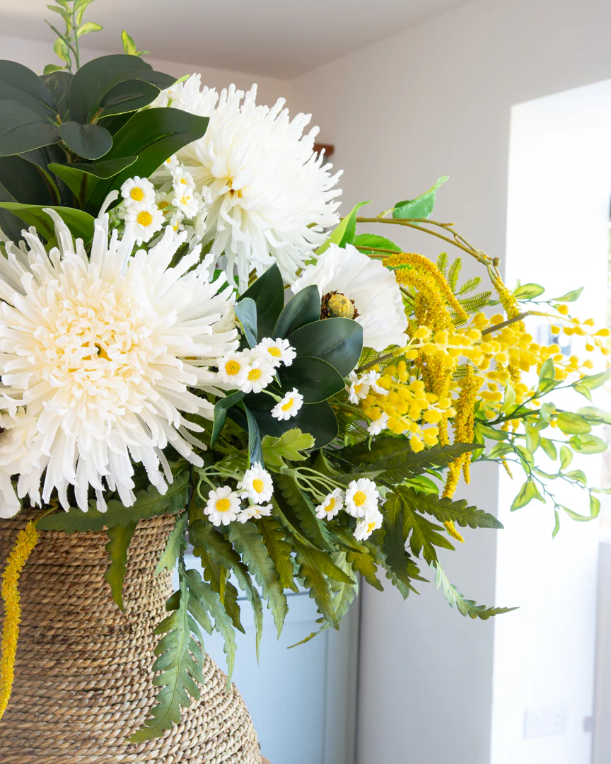 Packed full of ferns, poppies, chrysanthemums, daisies, bay leaves, mimosa and finished with catkins, this bouquet really is very special.