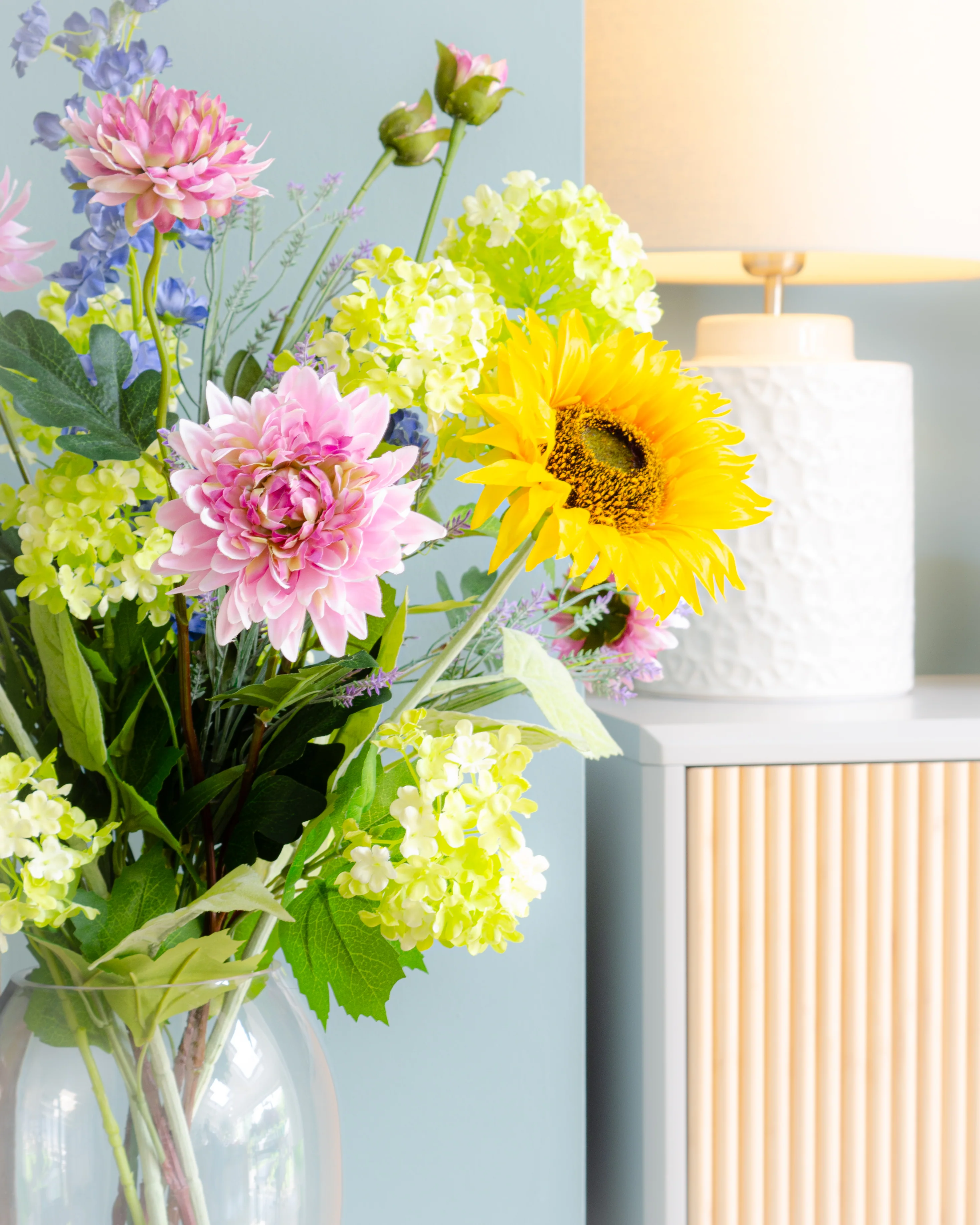 The most exceptional statement arrangement, made from the most stunning realistic sunflowers, finished with an abundance of wild meadow flowers, chrysanthemums, viburnum, blue delphiniums, larkspur, wild lavender and foliage. This arrangement comes complete in the vase and will transform your home, becoming a staple decor piece for years to come.