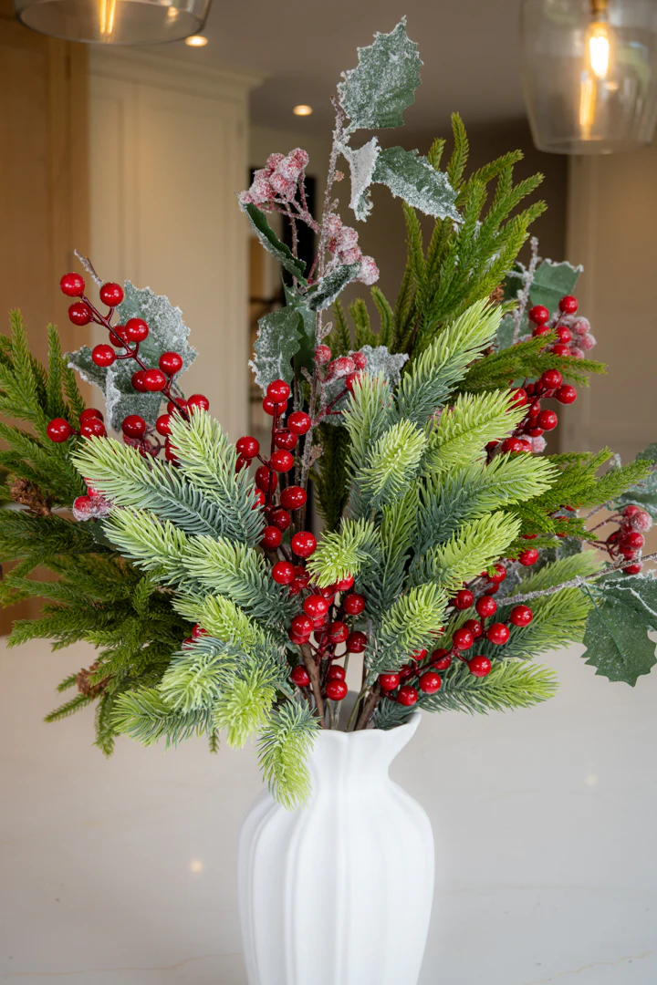 Bring a touch of Winter charm into your home with our Winter Pine & Berry Bouquet. Featuring lifelike pine, frosted holly stems and vibrant red berries, this lasting arrangement captures the beauty of the season without the fuss. Perfect for adding a warm, welcoming feel to your space, it stays fresh and radiant all winter long no watering, wilting or mess, just effortless natural elegance.